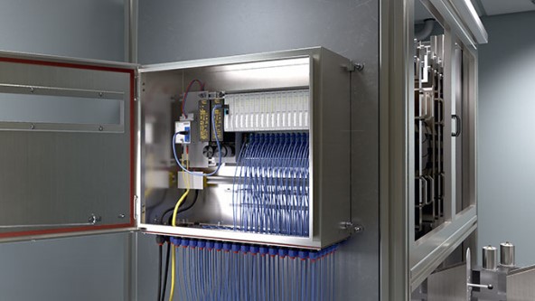 Users deploy the compact MT08-2G module carrier with the GEN-2G Ethernet Gateway. From there, data is transmitted via Ethernet to the production line controller. All excom components are certified for use in hazardous areas and can be installed in compact cabinets to save space. Integrated diagnostic functions provide status and process data. Thanks to multiprotocol support, this data can be transmitted in parallel over the same line, ensuring maximum security for process data communication. excom is considered the most compact I/O system of its kind. No other redundant I/O system for Ex areas can connect up to 960 signals in a standard control cabinet.