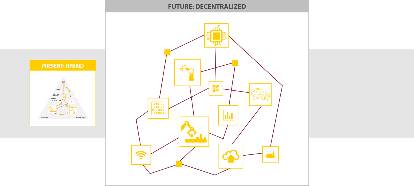 You can now utilize sensors that detect machine wear, RFID tags that tell the machine whether it is correctly configured for the next step and what it has to do, or an I/O module that decides independently to operate an actuator. It is no longer possible to place the present and future of automation at the levels of the classic automation pyramid. Decentralized intelligence compacts machine data into valuable information, laying the foundation for a new era of automation.