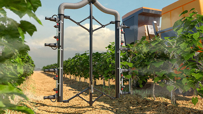 The winegrower benefits from adjusting the gradient of the sprayer boom in two ways: Firstly, the crop-protection agents continue to be precisely applied to the surface of the leaf and secondly, the booms do not damage any of the plants as the sprayer moves around the vineyard.