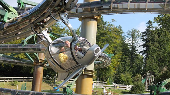 The Wie-Flyer is a suspended gondola-shaped two-seater, in which the riders can control its speed as required. The power for the flyers is supplied via a system integrated in the rails. An automatic distance control system is integrated in order to prevent collisions. This measures the position of the individual gondolas and lets them communicate between each other. In this way, the following gondola always knows the location the gondola in front.